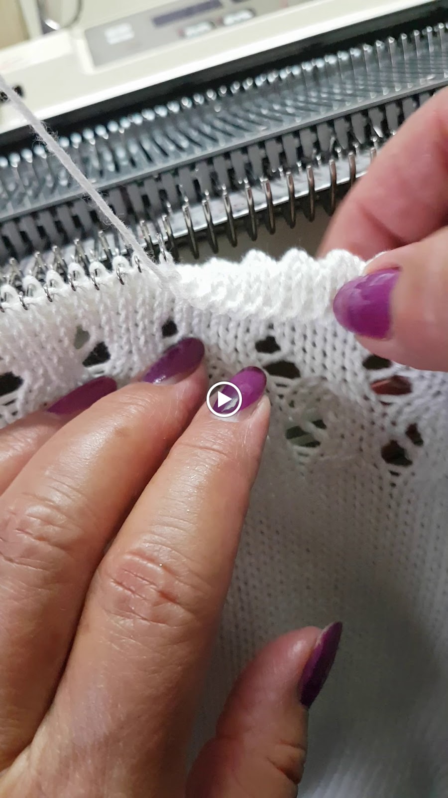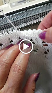 Bordino a picot per il lato lenzuolino ( 5 giri a tensione 9 , picot una maglia accavallata su quella di destra per tutto il bordo, un giro tensione 10 e 5 giri tensione 9).Ripiegare il bordino e chiudere sulla maccina direttamente ( viene un bordino rialzato molto d'effetto).
